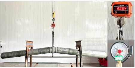正是基于双密封的结构特点,抗震双密封连接实现了挤压连接技术在大口径管的突破,并能满足2.5MPa的使用要求,同时提升了管网防震抗灾的能力。在抗震双密封连接的偏转角实验中,模拟管道遭遇大冲击大变形的场景,选取两段管径为DN300、长度为3米的管和一个直接管件压接为一套系统,打入水压2.75MPa,用吊车对连接部位上拉,当偏转角>10°拉力3064kg时稳压30分钟,系统未出现渗水。