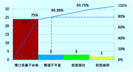不合格原因包括:沟槽质量不合格、管道不平直、胶垫错位、胶垫破损。其中沟槽质量不合格占到质量缺陷的75%,主要由三方面因素造成1、工人质量意识不强;2、技术交底不到位;3、滚槽设备带病工作。