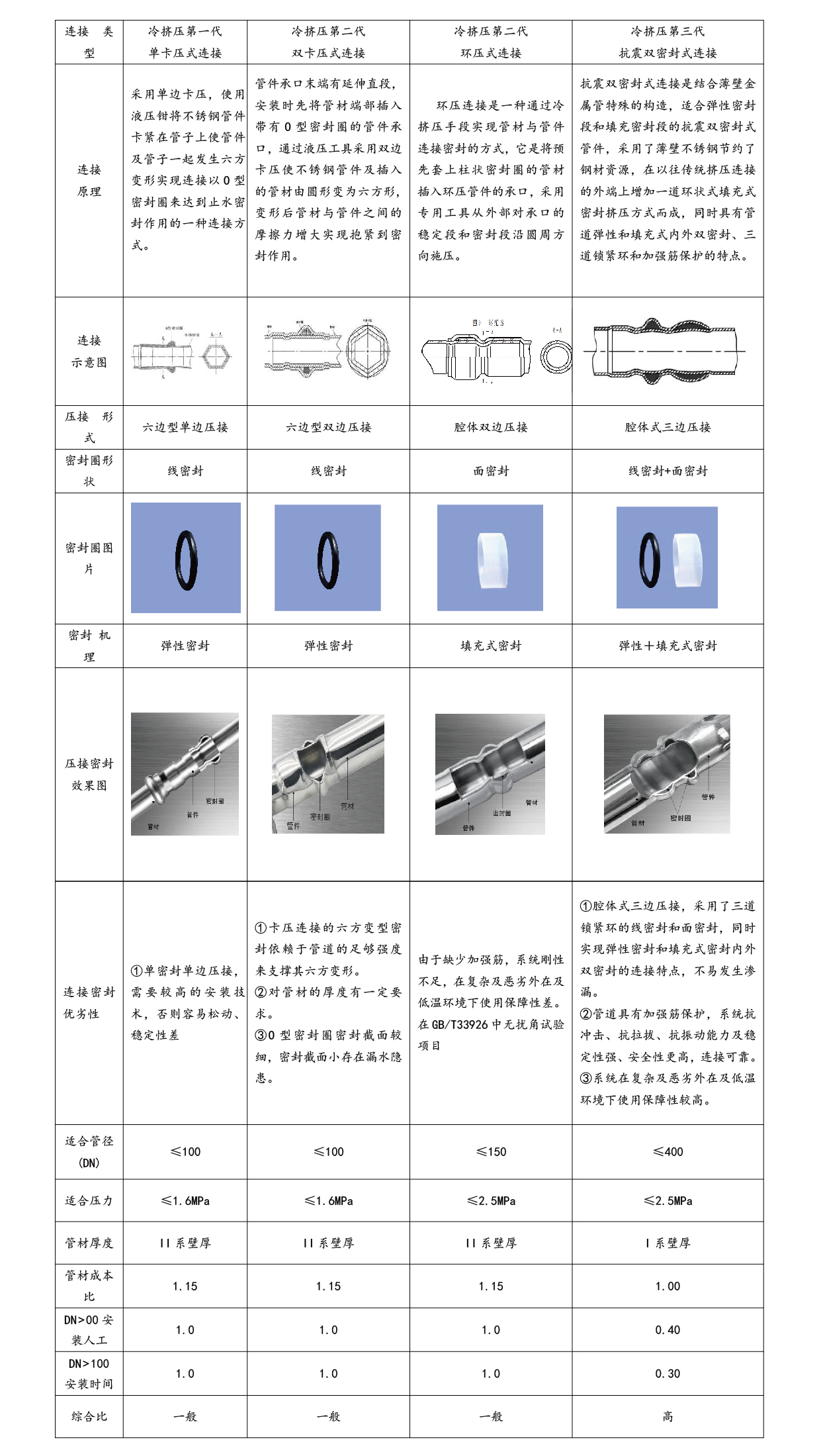 首先弥补了第一代和第二代挤压技术及大口径管道传统连接方式的不足。相比焊接、法兰连接金属管挤压连接的工艺更简单、快捷、成本更低;相比沟槽连接无需现场加工,接头质量没有隐患,杜绝了沟槽接头后期错位渗水的问题。